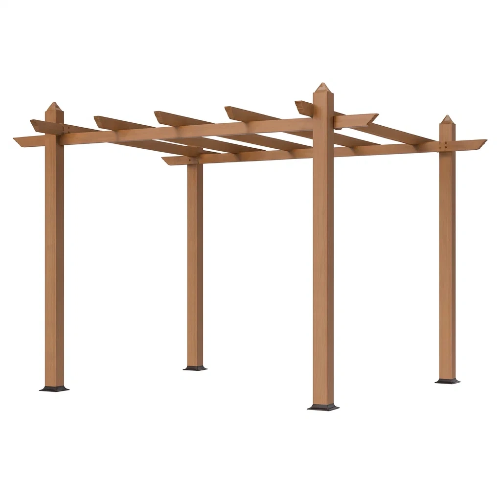 Diese Pergola besteht aus Massivholz und hat eine naturbelassene Oberflächenbehandlung.